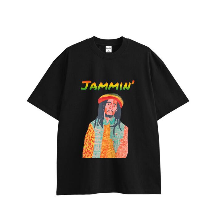 胸に掲げた “Jammin’” は、レゲエの象徴であり、